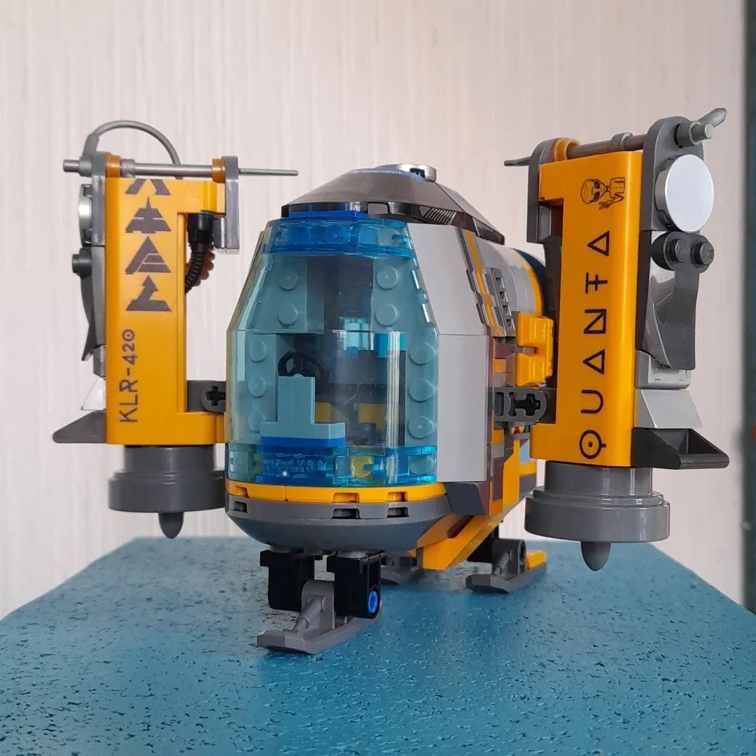 There is so much to love about this ship design, from the cockpit module for a pilot to lay down between clear windshields, to the arms from the Mobile Construction Crane used for the wings, to the pair of Nexo Knight hubs/grinders wrapped with a Dots bracelet.