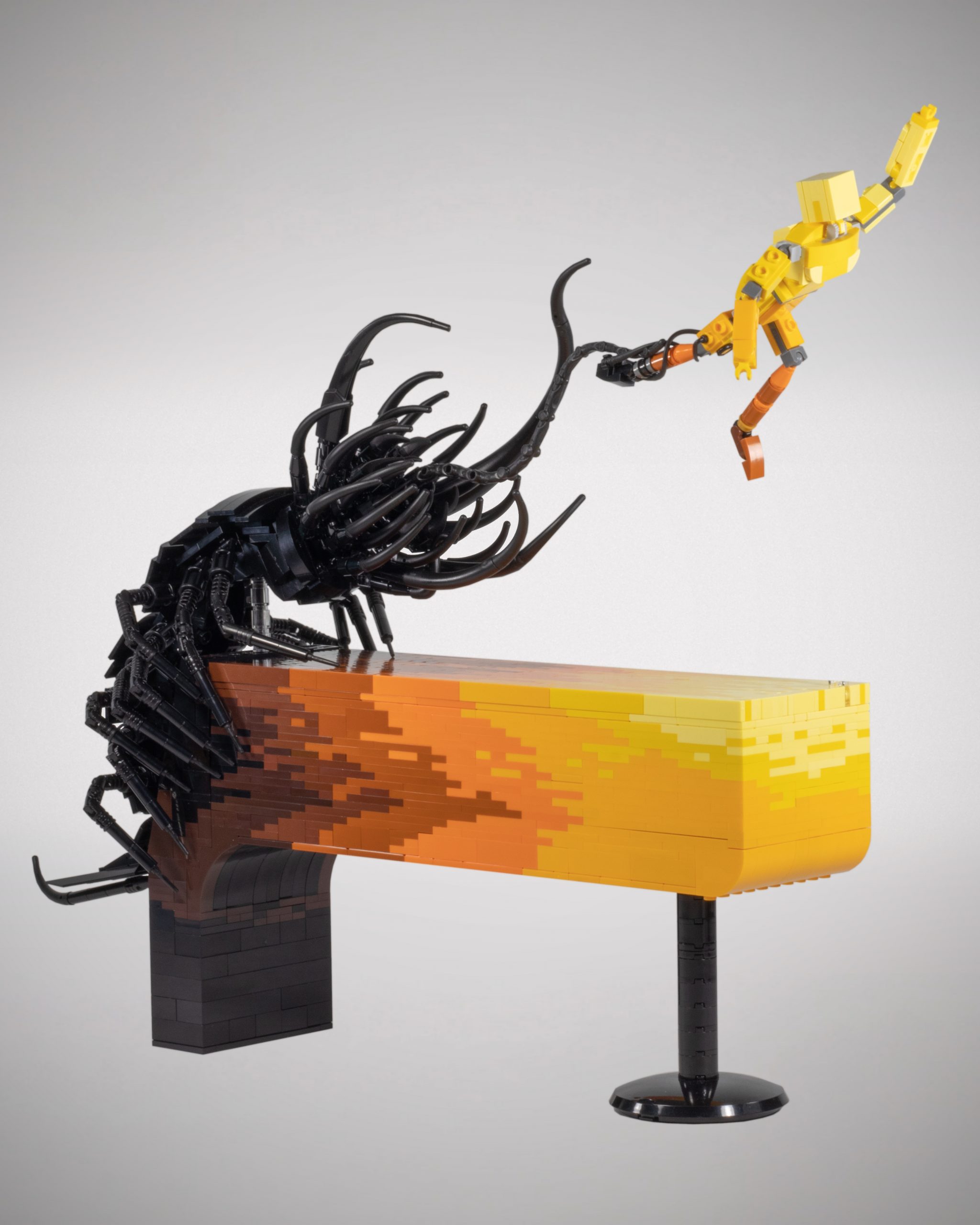 (1) while Nannan Zhang’s abstract work didn’t immediately influence my building style as a TFOL, encountering it in the early 2010s left a lasting impression -especially Metamorphosis of the Mind (Echo of Silence, Cry of Dreams, and Legacy of Vision). Something about that series, and his broader body of work, became a well of inspiration later in life as a future-forward approach to the LEGO medium. As I reflected on how to challenge myself as a builder in my late 20s, moving in that direction felt particularly compelling.(2) In the late 2010s, I became deeply interested in “miniland-plus” figurines, especially through pop culture builds from The Force Awakens, Stranger Things, and Back to the Future. While I loved creating them, the figures lacked dynamism, emotion, and drama – they needed an extra “umph” to be truly compelling. Even so, many of my AFOL friends encouraged me to stick with this style as one of my strengths.