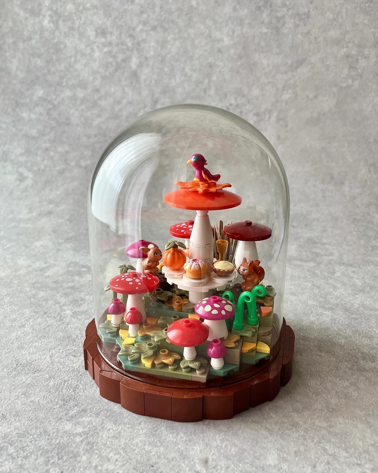 LEGO’s Botanicals line introduced many to the world of brick-built decor, but for builders like umemaruko, LEGO has always been a medium for elegant home decorating. Alongside her wall hangings and table settings, umemaruko celebrates the seasons with a rotating mix of bell jar vignettes. Her latest is an enchanting encapsulation of fall featuring forest critters picnicking among mushrooms.